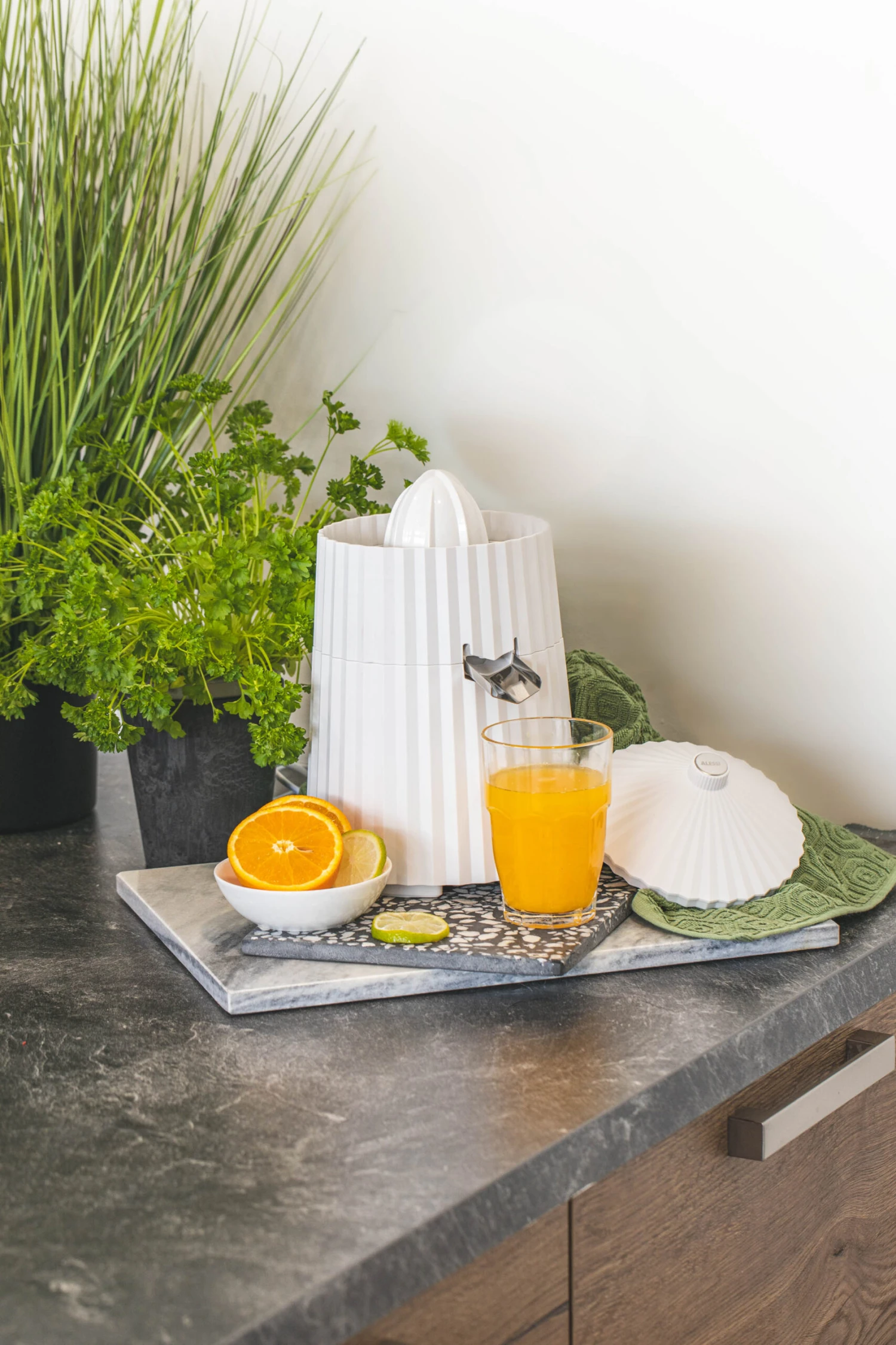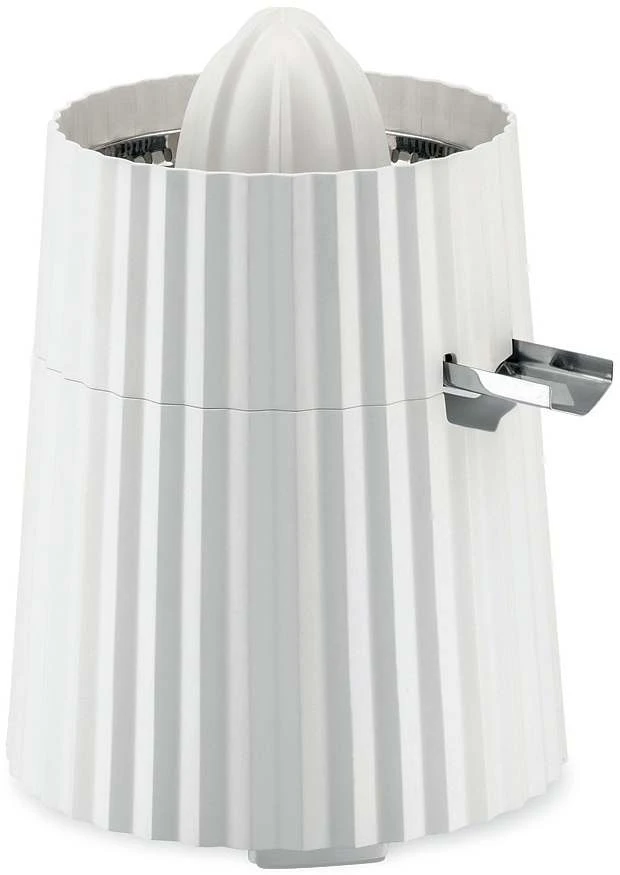 Deze Citruspers komt uit de Alessi Plissé collectie en is ontworpen door designer Michele De Lucchi. Zijn ontwerp is gebaseerd op de Franse Haute Couture mode. De structuur met plooien verandert het apparaat in een driedimensionale vorm. Door het fascinerende ontwerp is de elektrische citruspers niet alleen handig in gebruik, maar ook een klein onderdeel van je interieur. De citruspers beschikt over een handige start- en stopfunctie, waardoor hij automatisch uitschakelt zonder druk. Bovendien is hij makkelijk schoon te maken doordat de perskegel en het zeefinzetstuk vaatwasserbestendig zijn. Kortom, een prachtig object om op je keukenblad te laten zien!