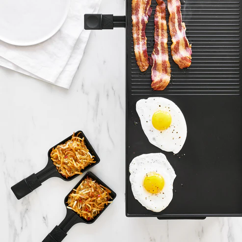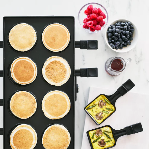 bakplaat aan de ene kant, uitsparingen voor pannenkoeken aan de andere. Perfect voor feestjes,
