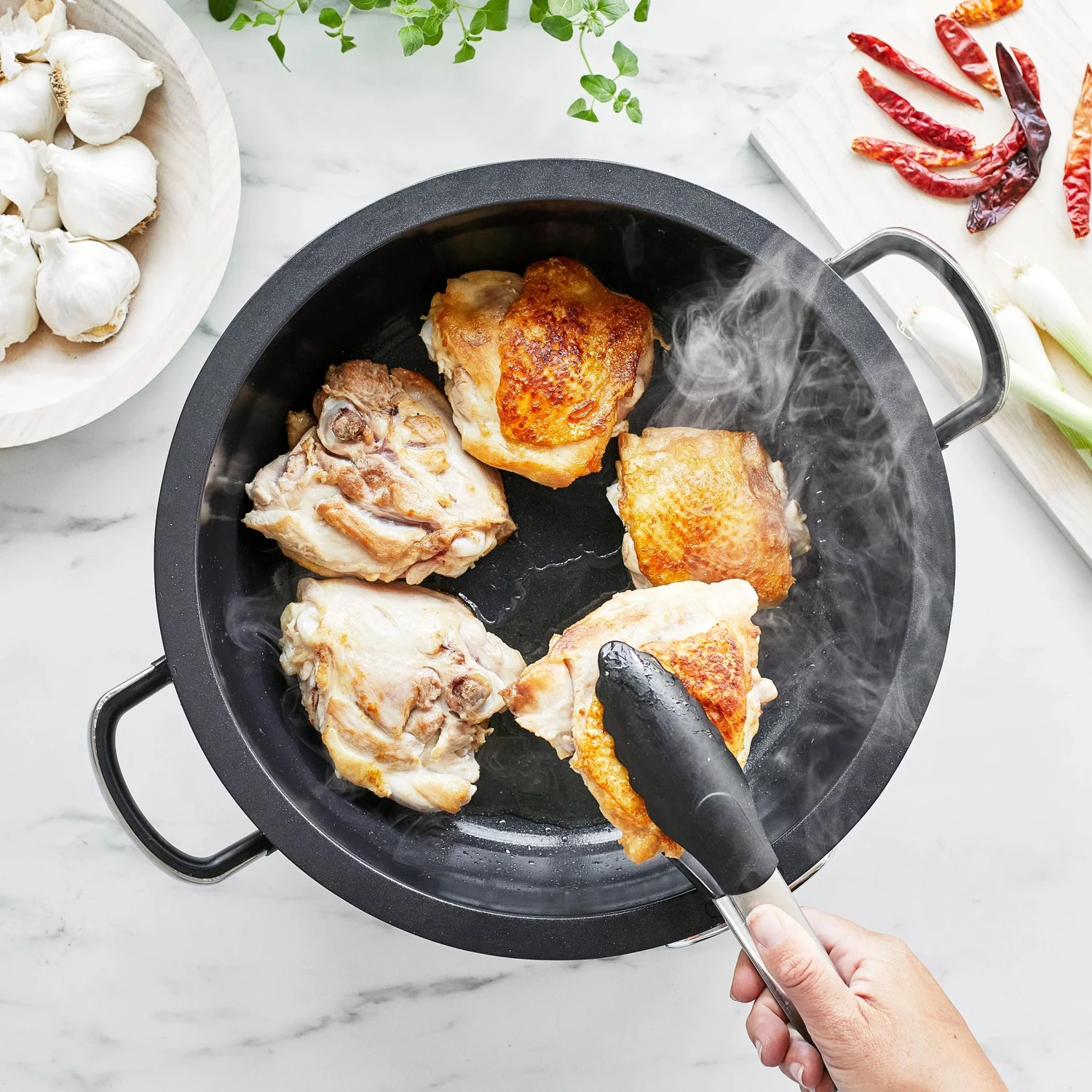 Pannen met een keramische aanbaklaag zijn bestand tegen temperaturen tot 400 ℃ en zorgen voor een krokant laagje om je ingrediënten. Hierdoor zijn deze pannen met name geschikt voor het bakken van vlees en groenten. Het laagje keramiek moet met de hand gereinigd worden en kan dus niet in de vaatwasser.