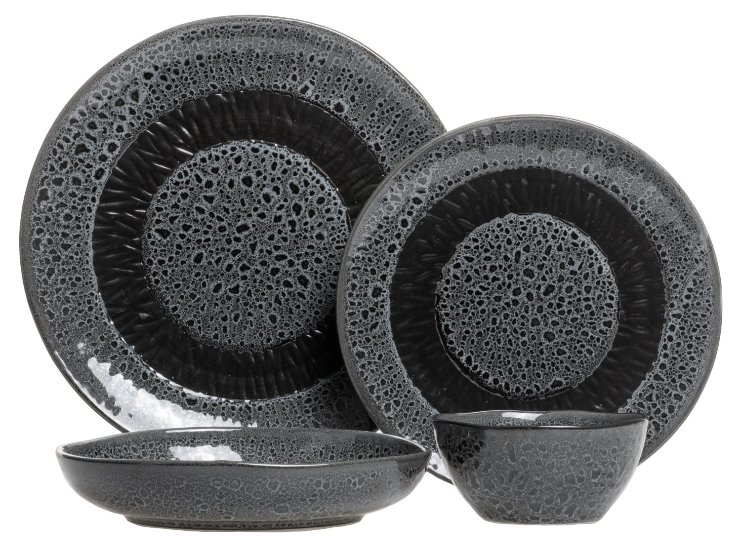 Het servies is afgewerkt met een ‘reactive glaze‘, ofwel reactief glazuur. Dit houdt in dat tijdens het bakproces van het servies een chemische reactie plaatsvind. Deze reactie zorgt ervoor dat elk item van het servies een eigen uniek kleurpatroon krijgt. Hierdoor ontstaan allemaal unieke borden, kommen en bekers. Groot is het verschil niet, het geheel past perfect bij elkaar!